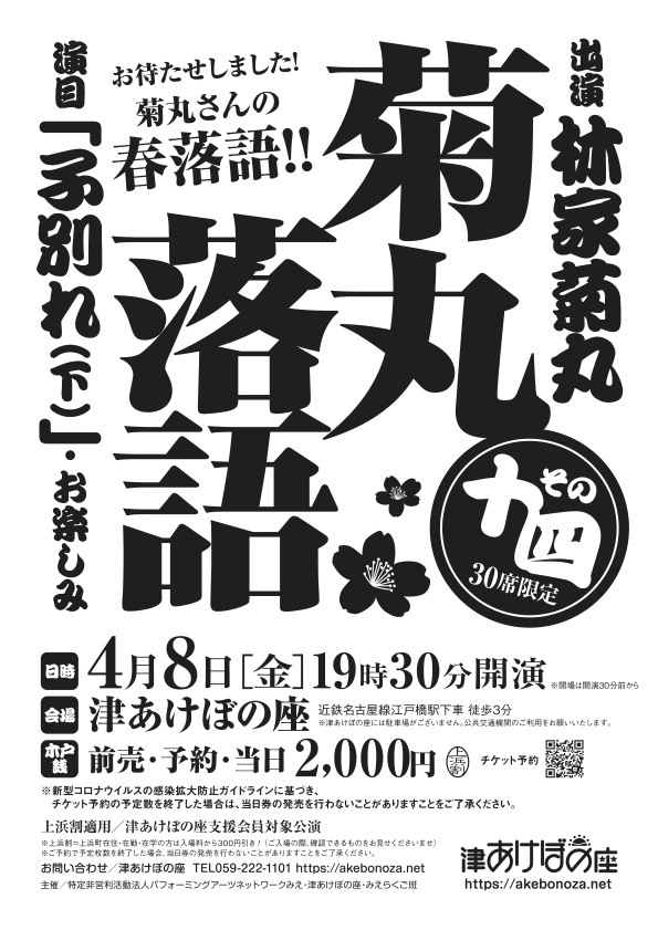 津あけぼの座では開館以来「一人会」を続け、2010年には「8時間耐久落語」、2011年・2012年には月亭方正との二人会なども行う。2014年9月 三代目 林家菊丸を襲名。